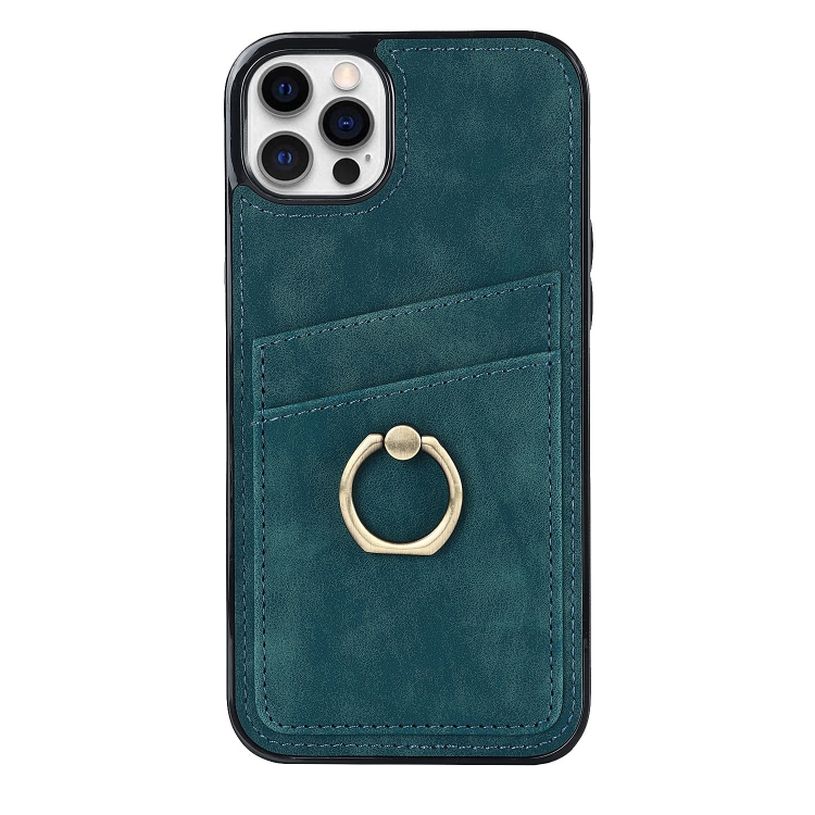 Funda de Cuero para iPhone 12 Pro Max Vintage Patch con Soporte para Anillo (Azul)