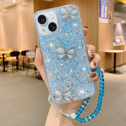 Funda para Teléfono TPU Epoxi iPhone 13 Mariposa de Jade Lentejuelas Estrelladas con Correa (Azul)