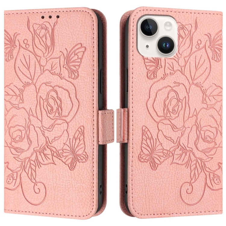 Estuche para teléfono iPhone 13 Mini cuero antirrobo RFID con rosa en relieve (Rosa)