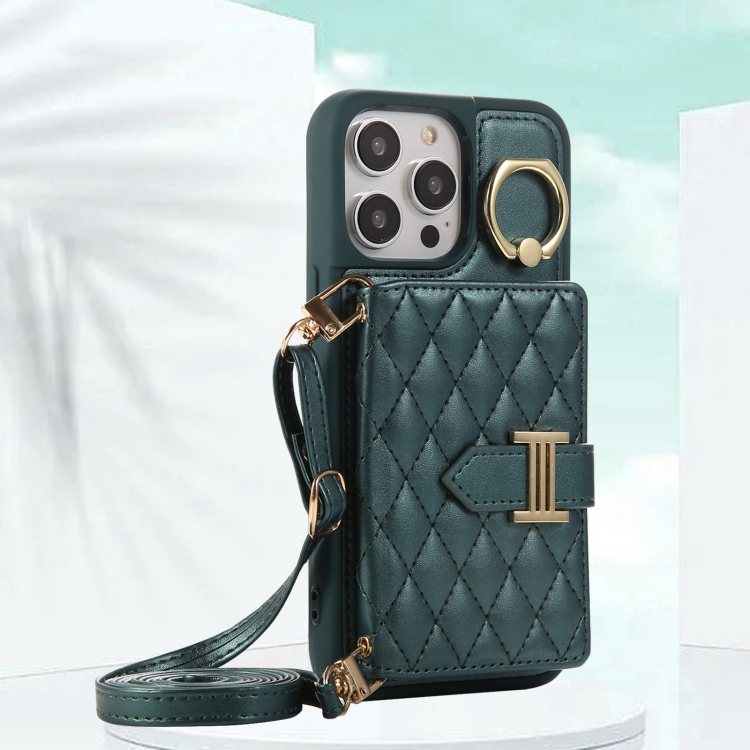 Funda para iPhone 13 Pro Horizontal Card Bag Ring Holder con Doble Cordón (Verde Oscuro)