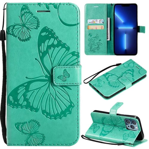 Estuche para iPhone 13 Pro Max Cuero Tapa Horizontal Patrón Mariposa 3D Soporte Ranura Tarjeta Billetera Cordón (Verde)