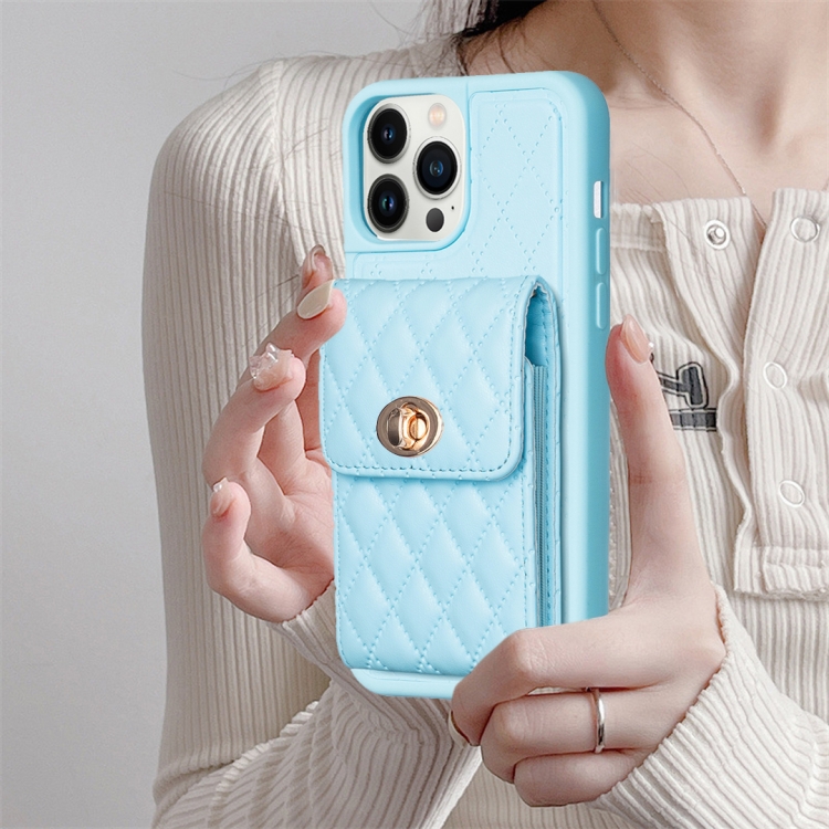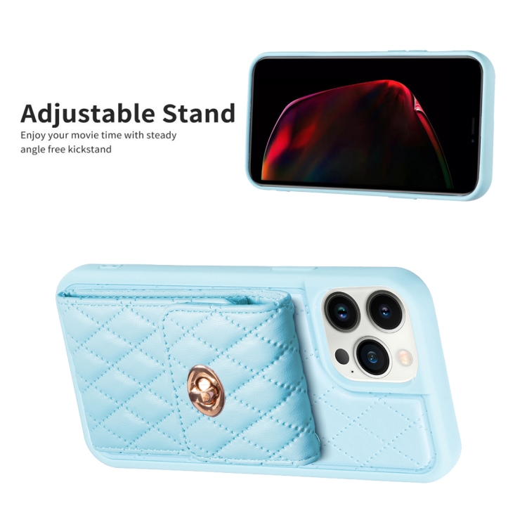 Funda para teléfono iPhone 13 Pro Max Vertical Metal Hebilla Monedero Rombico Cuero (Azul)
