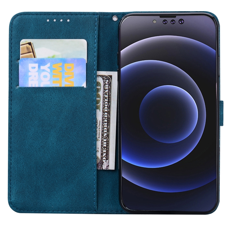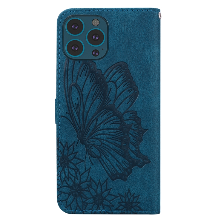 Funda de cuero para iPhone 13 Pro Retro Skin Feel Butterflies con tapa horizontal en relieve, soporte y ranuras para tarjetas y billetera (Azul)
