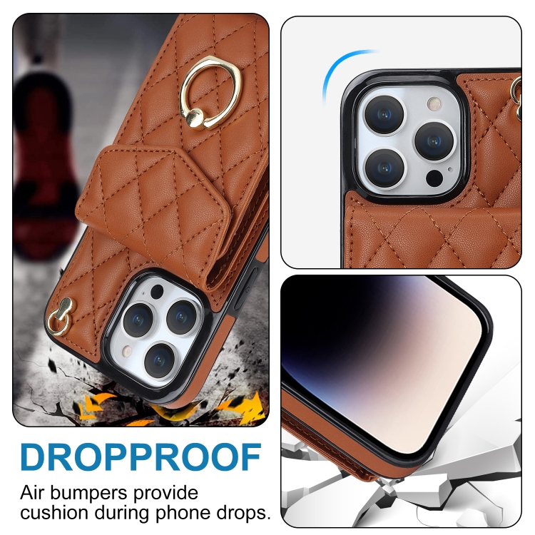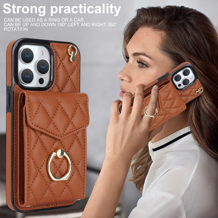 Funda para Teléfono iPhone 13 Pro Rhombic Texture Card Bag con Cordón Largo (Marrón)