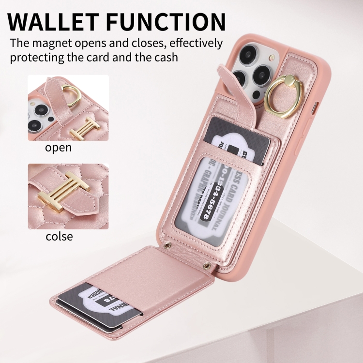 Funda para iPhone 13 Pro Vertical Card Bag Ring Holder con Doble Cordón (Oro Rosa)