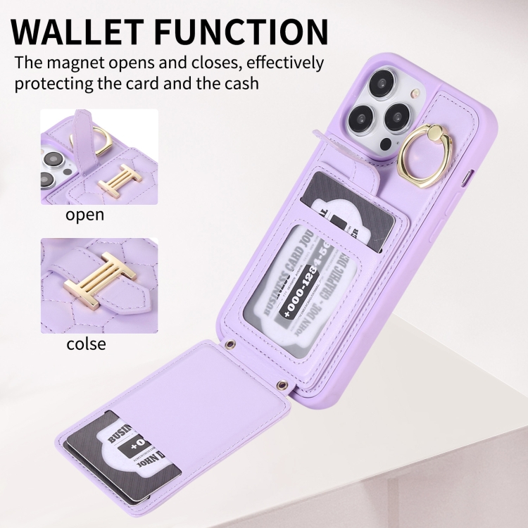Funda para iPhone 13 Pro Vertical Card Bag Ring Holder con Doble Cordón (Púrpura)