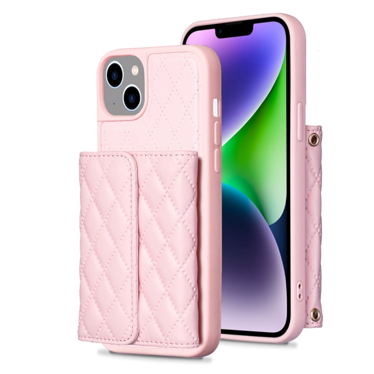 Estuche de Teléfono para iPhone 14 Cuero Rómbico con Billetera Horizontal (Rosa)
