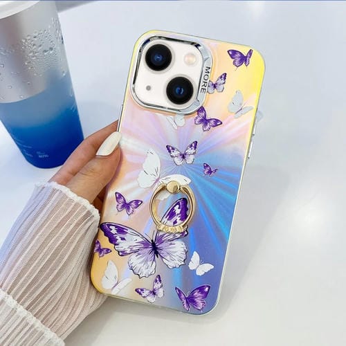 Estuche para teléfono iPhone 14 con soporte para anillo de mariposa láser con galvanoplastia (Morado Blanco)