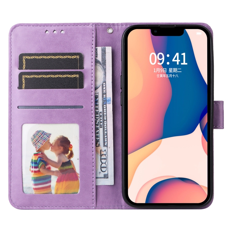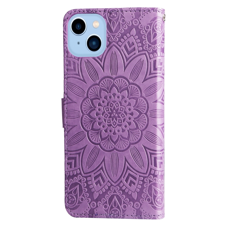 Estuche para Teléfono iPhone 14 Cuero Estampado Girasol En Relieve (Púrpura)