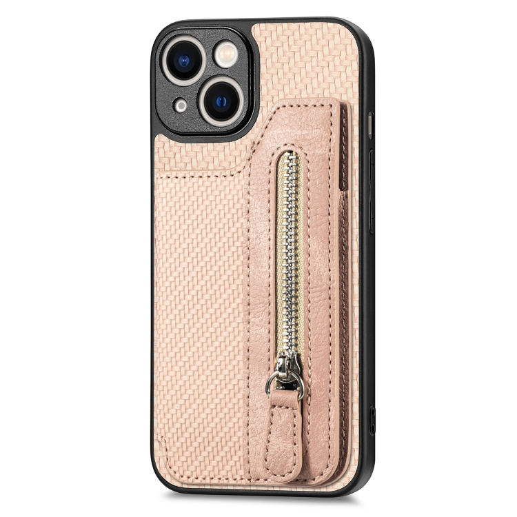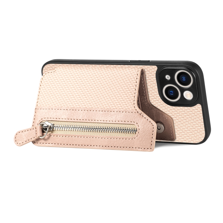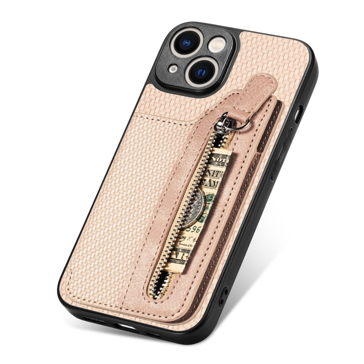 Funda de teléfono iPhone 14 con billetera y cremallera horizontal de fibra de carbono (Caqui)