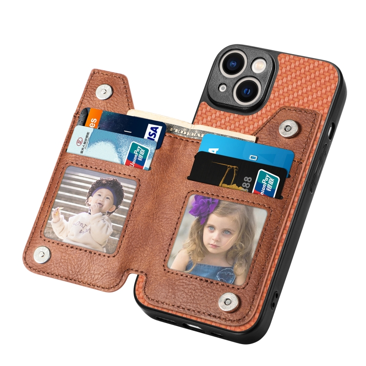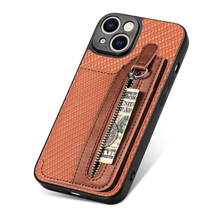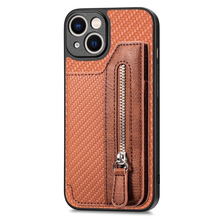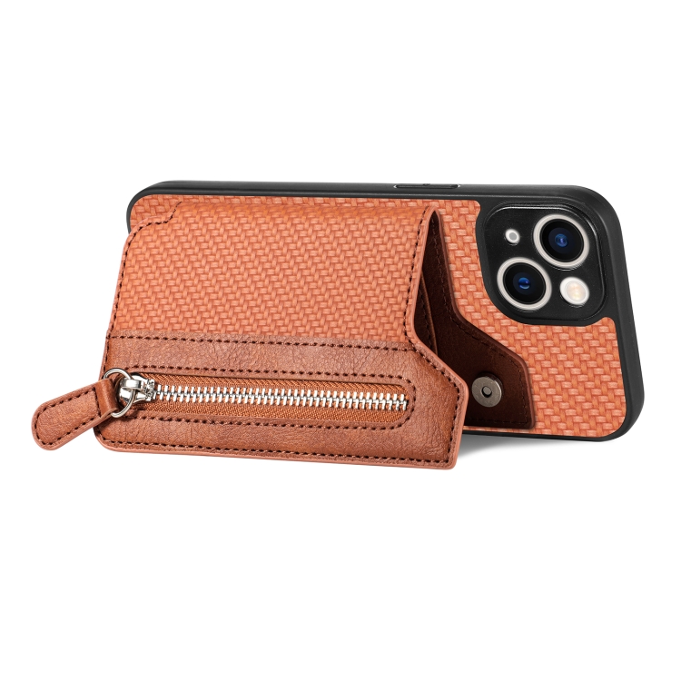 Funda de Teléfono para iPhone 14 con Cremallera y Tapa Horizontal de Fibra de Carbono (Marrón)