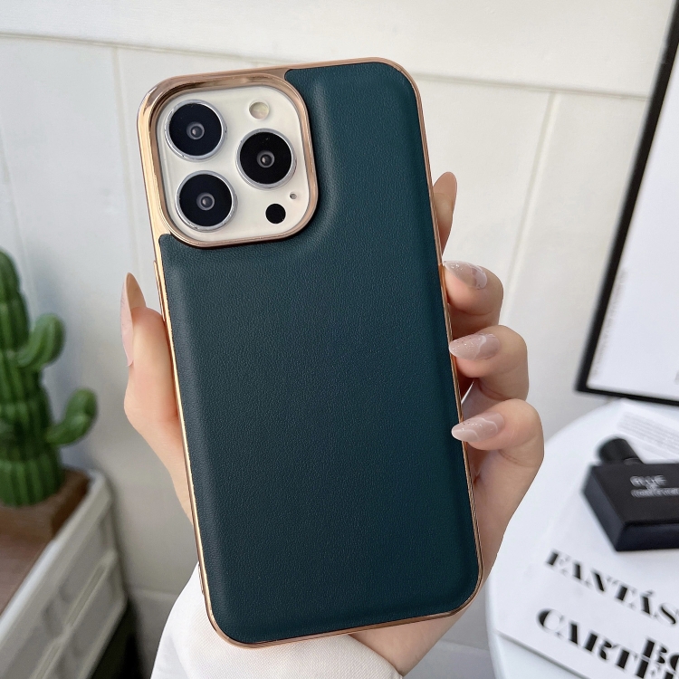 Funda de Teléfono iPhone 14 Xiaoya Galvanoplastia Nano Cuero Genuino (Verde Oscuro)