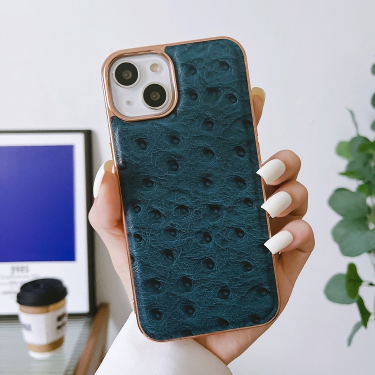 Funda para iPhone 14 Nano de Cuero Genuino con Textura de Avestruz (Azul)