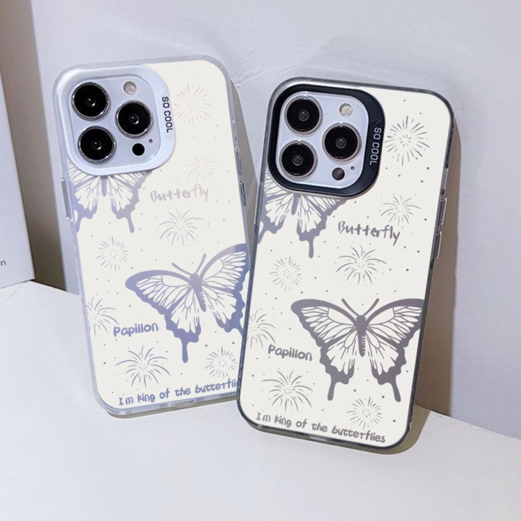 Caja de teléfono híbrida para iPhone 14 Pro TPU y PC con pintura plateada (Mariposa hueca negra)