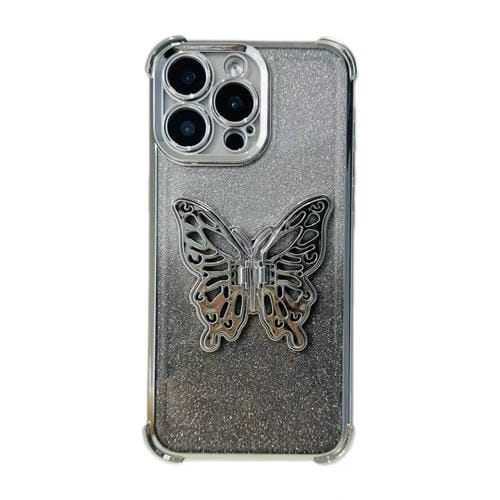 Estuche para Teléfono TPU iPhone 14 Pro Max a Prueba de Golpes con Mariposa 3D y Purpurina Galvanizada (Plata Degradada)
