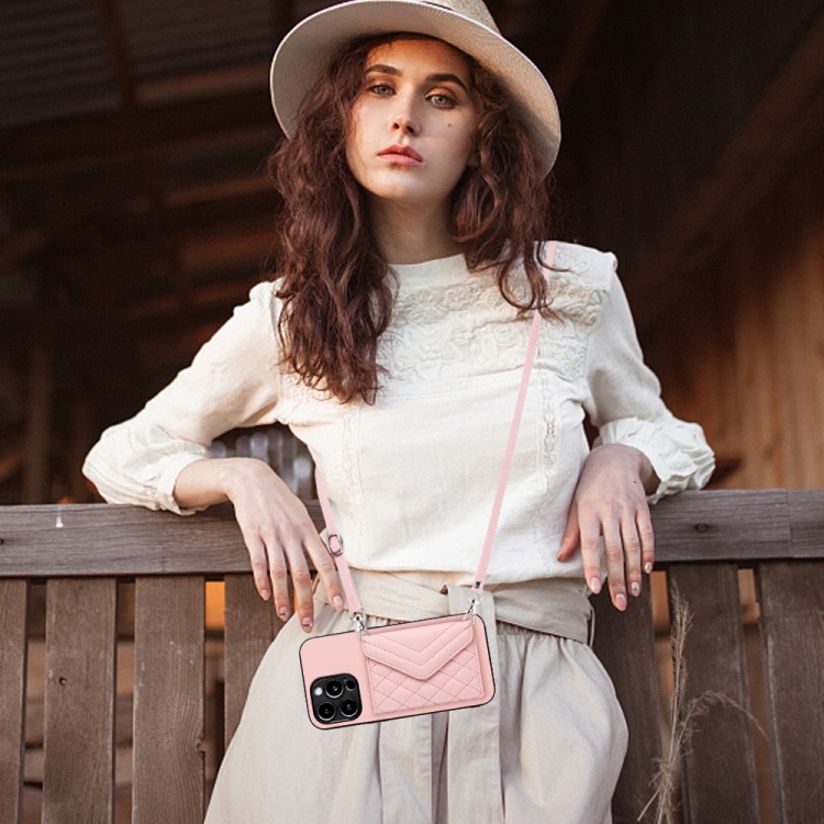 Estuche para Teléfono iPhone 14 Pro Max Rfid con Bolsa para Tarjetas Textura Rómbica y Cordón Largo (Oro Rosa)