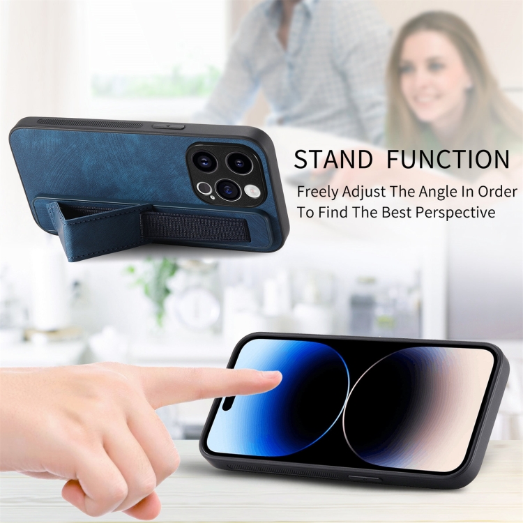 Funda Trasera para iPhone 14 Pro Max Retro Muñequera de Cuero (Azul)