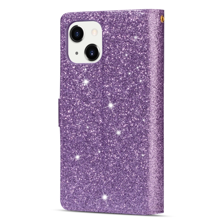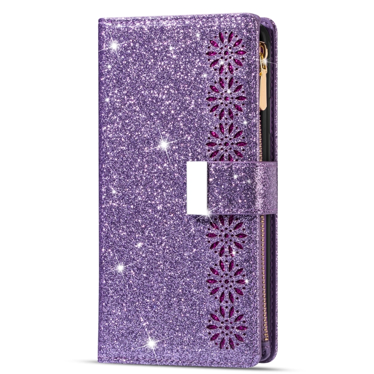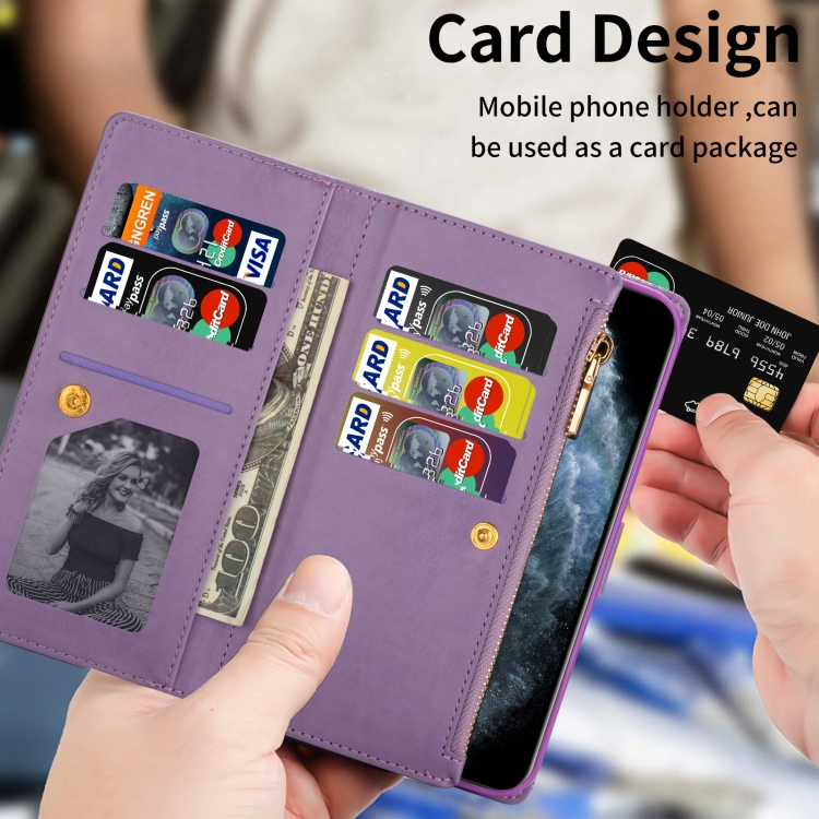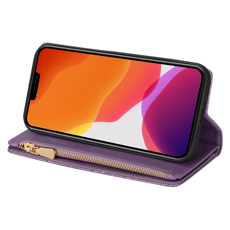 Estuche de Cuero para iPhone 14 Ranuras para Tarjetas Múltiples con Cremallera y Brillo Tallado con Láser (Púrpura)