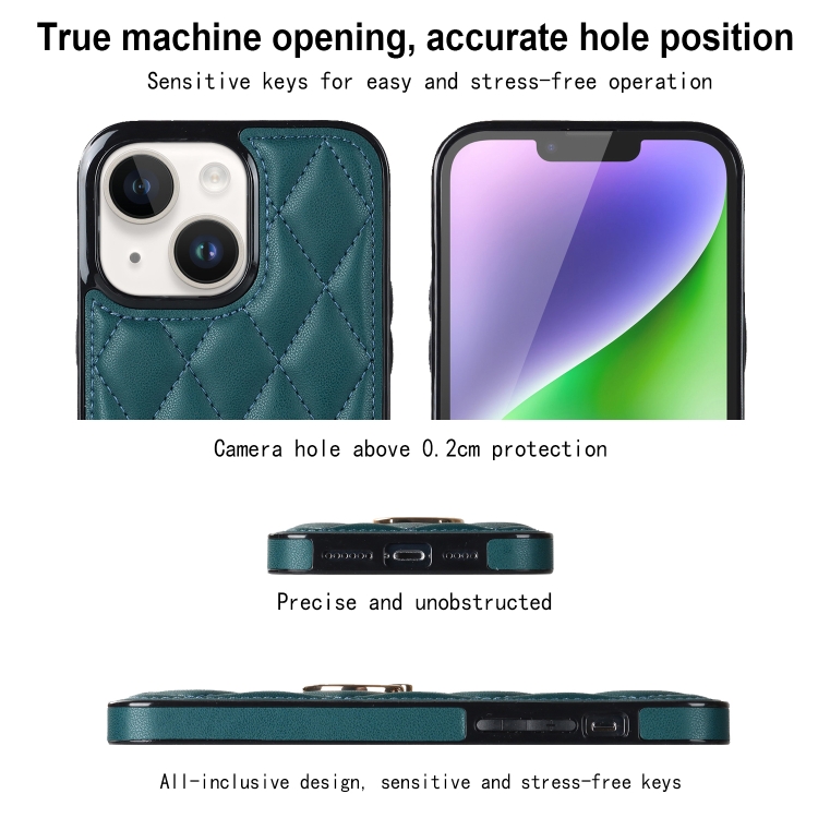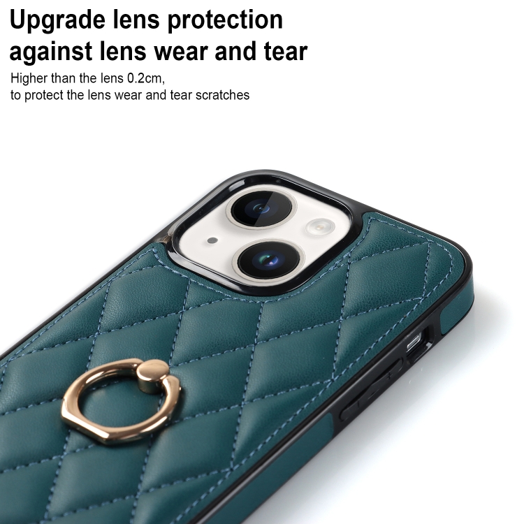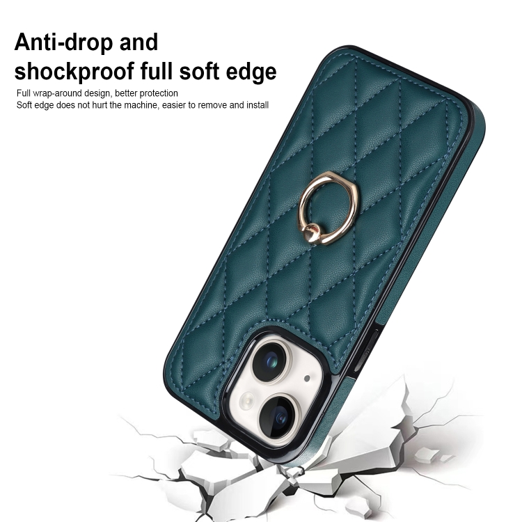 Funda para teléfono iPhone 14 Rhombic PU Cuero con soporte para anillo (Verde)