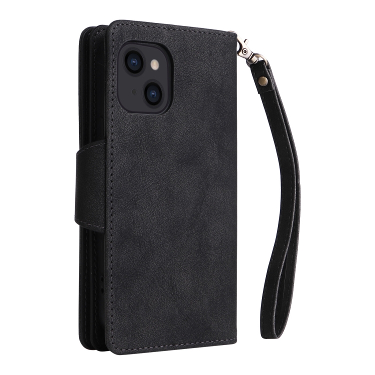Funda para Teléfono iPhone 14 Rivet Buckle 9 Cards Cuero Tres Pliegues (Negro)