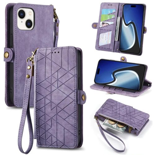 Funda de Cuero para Teléfono iPhone 15 con Cremallera Geométrica y Hebilla Lateral (Púrpura)