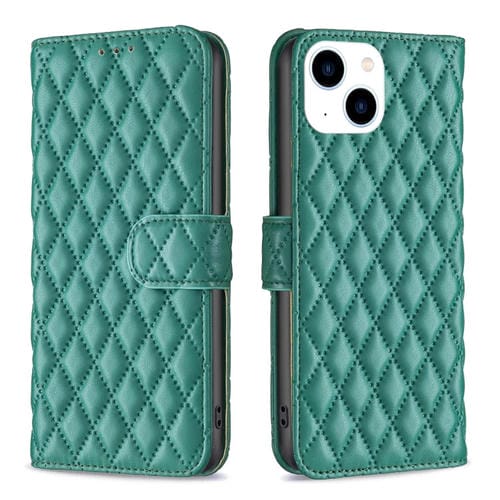 Funda para Teléfono iPhone 15 Diamond Lattice Wallet Flip de Cuero (Verde)