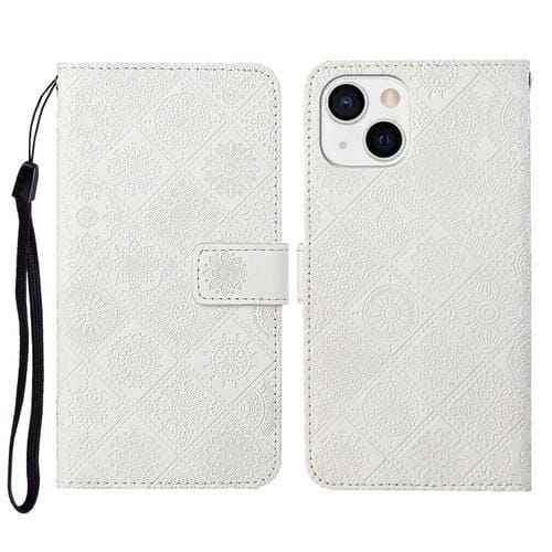 Estuche para Teléfono iPhone 15 Cuero Patrón En Relieve Estilo Étnico (Blanco)