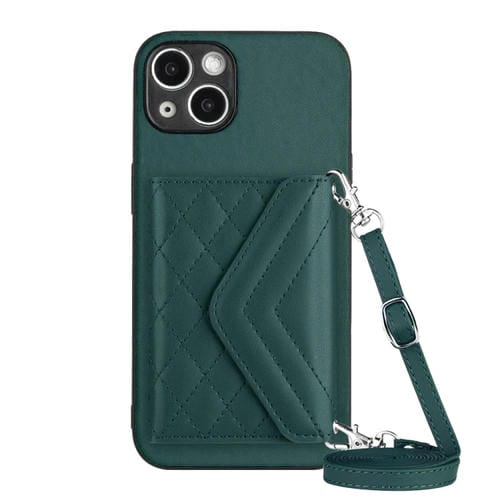 Estuche para Teléfono iPhone 15 con Bolsa para Tarjetas Rfid Textura Rómbica Cordón Largo (Verde)