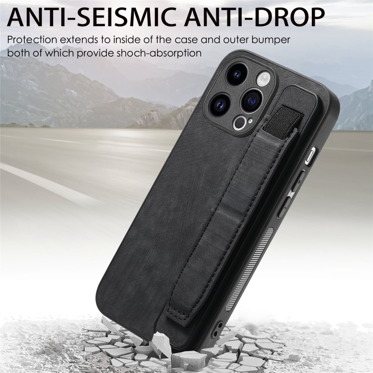 Funda Trasera para iPhone 15 Cuero con Soporte para Pulsera Retro (Negro)