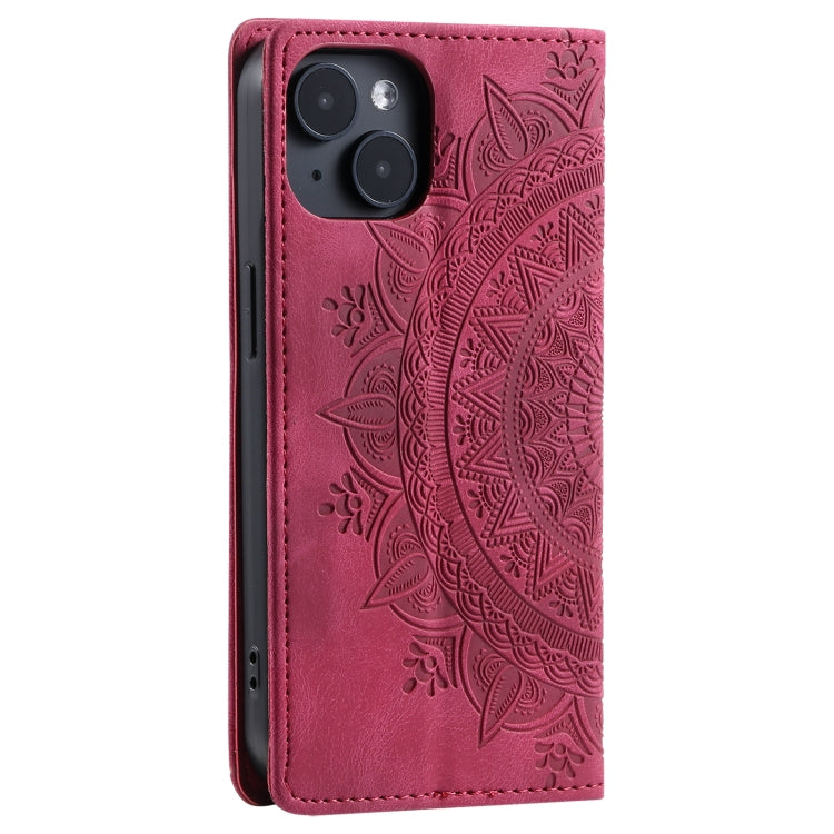 Estuche para Teléfono iPhone 15 Plus Cuero Magnético Relieve de Tótem (Rojo)