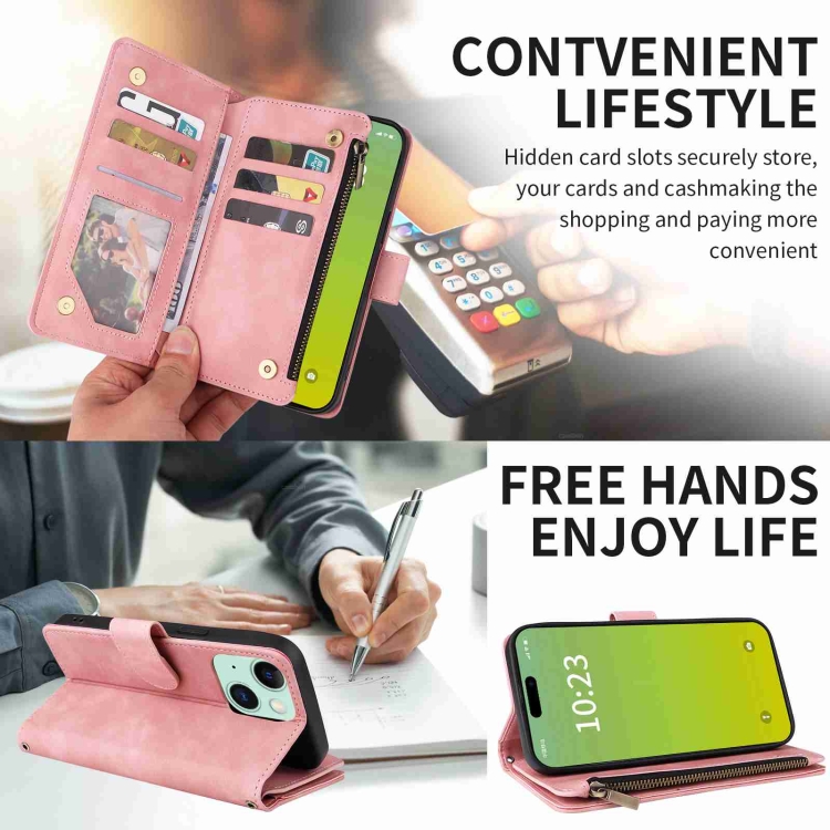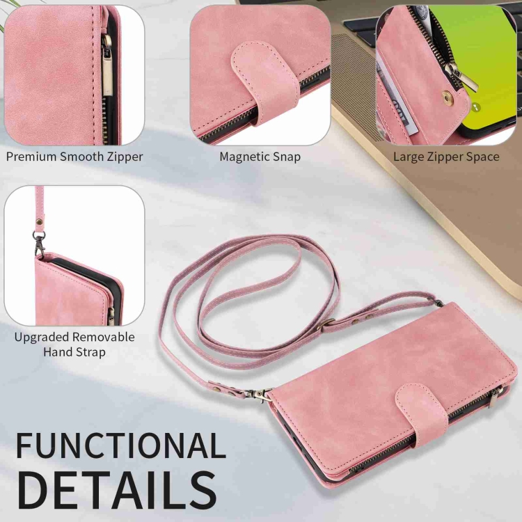 Funda Cruzada de Cuero para iPhone 15 Plus con Cremallera y Ranura para Tarjetas (Rosa)
