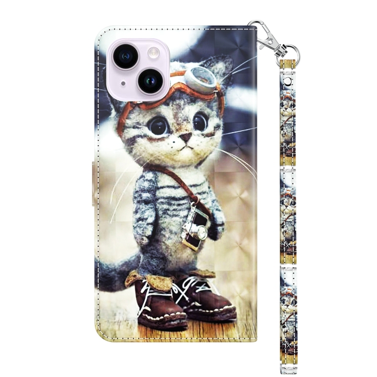 Funda de Cuero para iPhone 15 Plus Pintada En 3D Gato Travieso