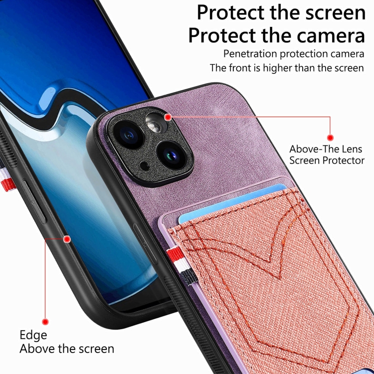 Funda para iPhone 15 Plus Piel de Cuero Textura Mezclilla Ranura para Tarjeta (Púrpura)