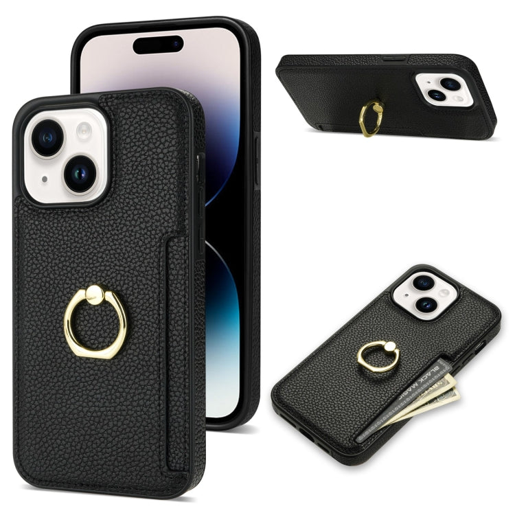 Funda Trasera para iPhone 15 Plus Ring Card Litchi Cuero (Negro)