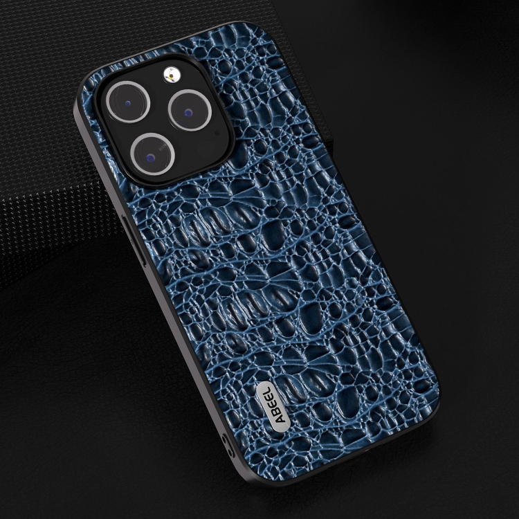 Funda de teléfono Abeel para iPhone 15 Pro Max con borde negro y dosel de cuero genuino (Azul)