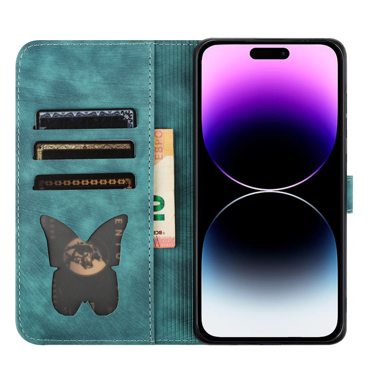 Funda para iPhone 15 Pro Max Butterfly Cat de Cuero con Tapa en Relieve (Wathet)