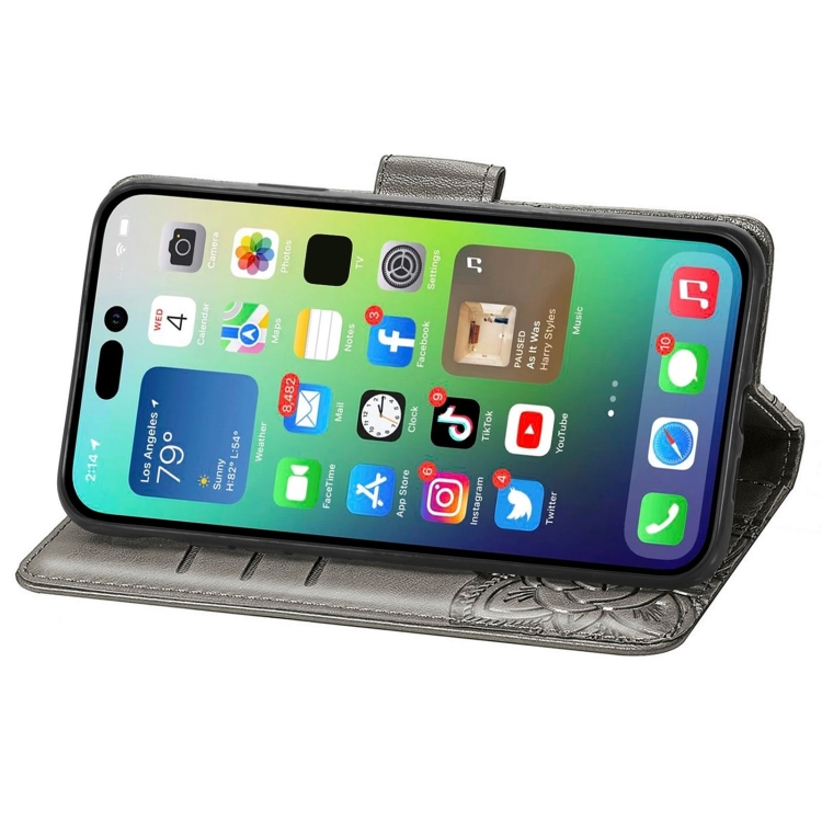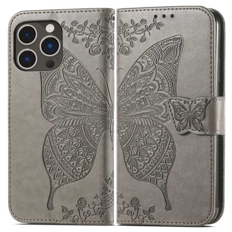 Estuche para Teléfono iPhone 15 Pro Max Butterfly Love Flower Cuero En Relieve (Gris)