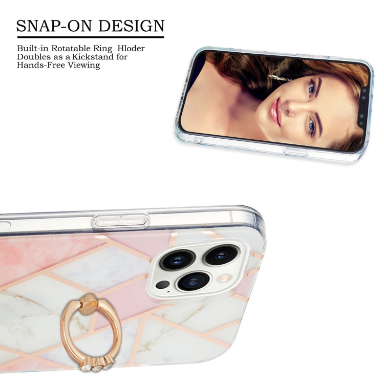 Estuche para iPhone 15 Pro Max Galvanoplastia Empalme Mármol Patrón Imd TPU a Prueba de Golpes con Soporte para Anillo (Rosa Blanco)