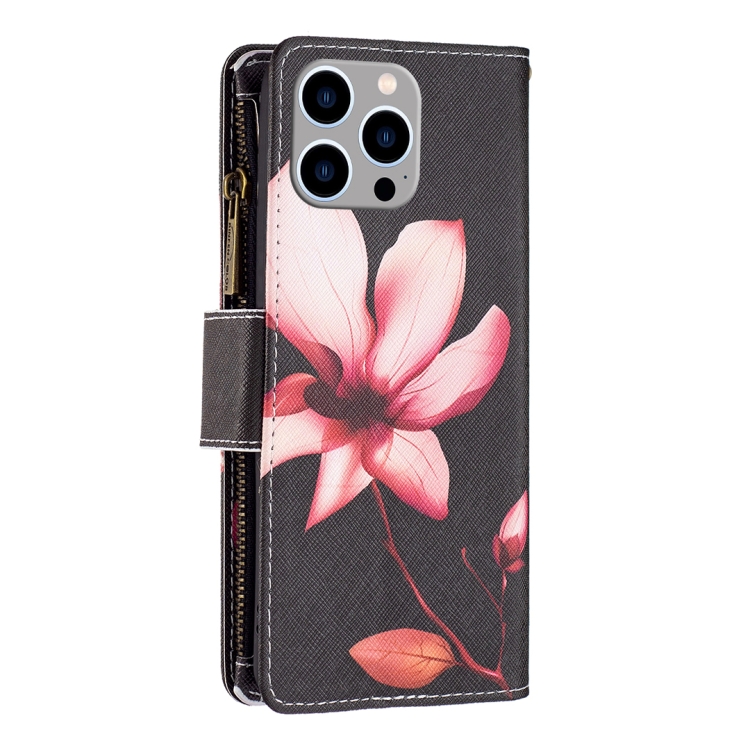 Funda de Cuero para iPhone 15 Pro Max Patrón de Dibujo Coloreado con Cremallera (Lotus)