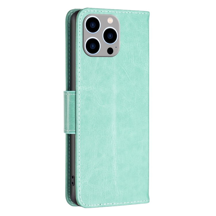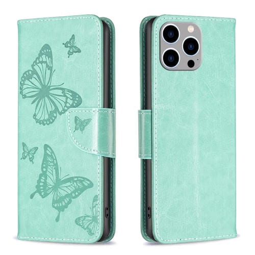 Funda para Teléfono iPhone 15 Pro Max Cuero Relieve Dos Mariposas (Verde)