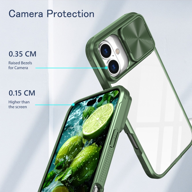 Estuche para teléfono iPhone 16 Plus TPU híbrido acrílico con escudo de levas deslizante (Verde Oliva)