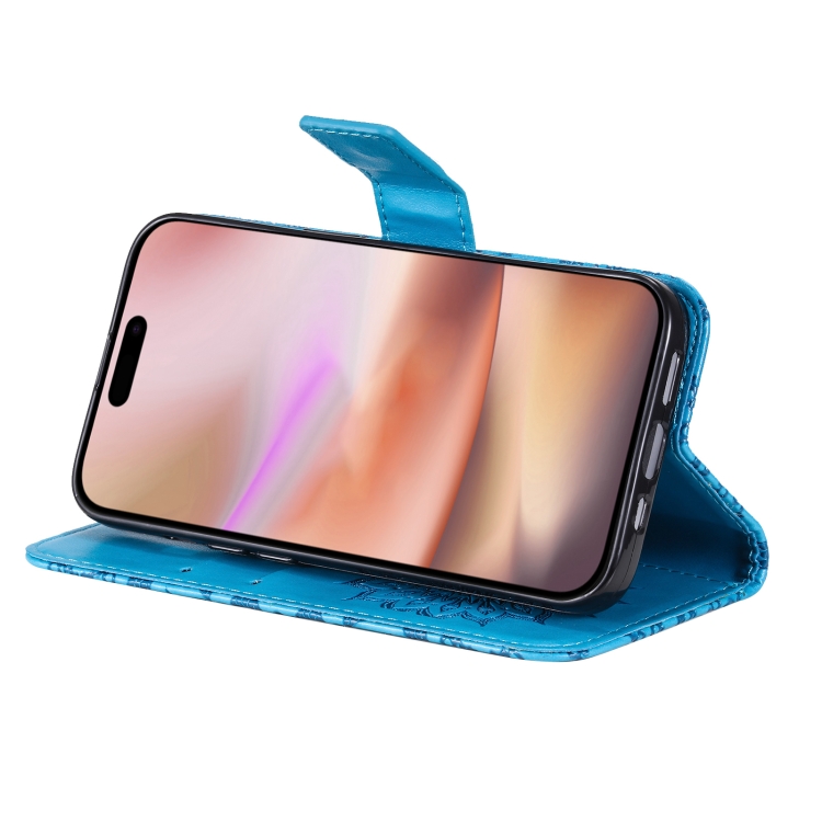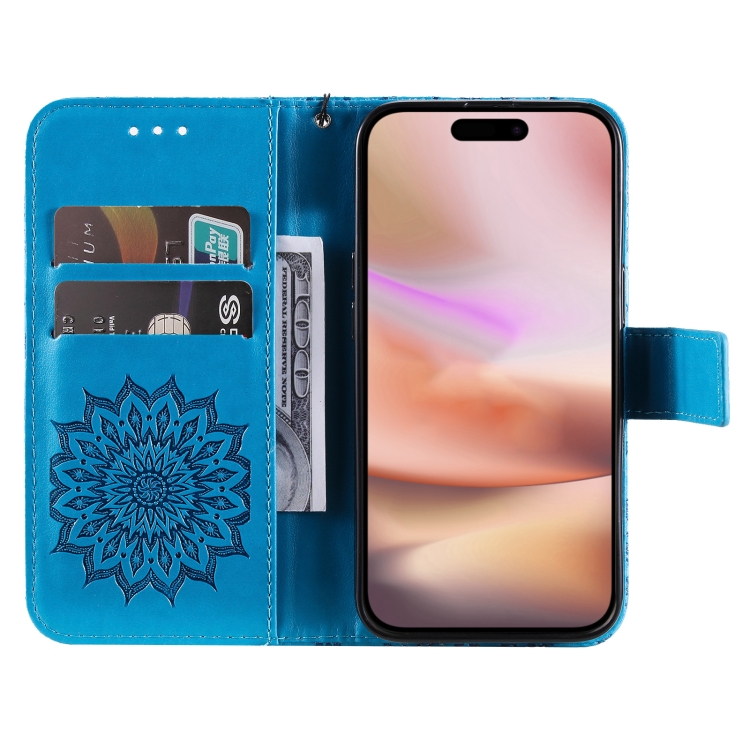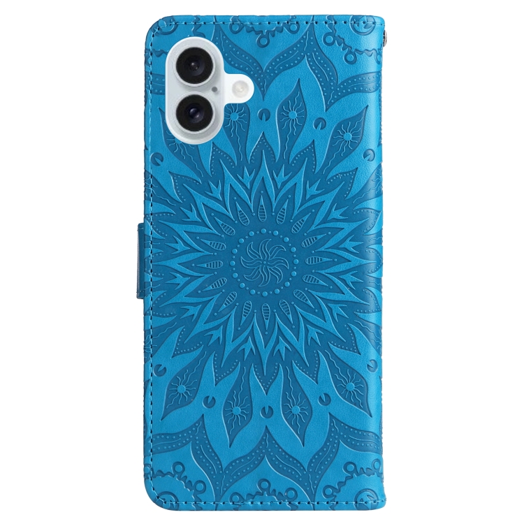 Funda de Cuero para iPhone 16 Plus con Tapa y Patrón de Girasol en Relieve (Azul)