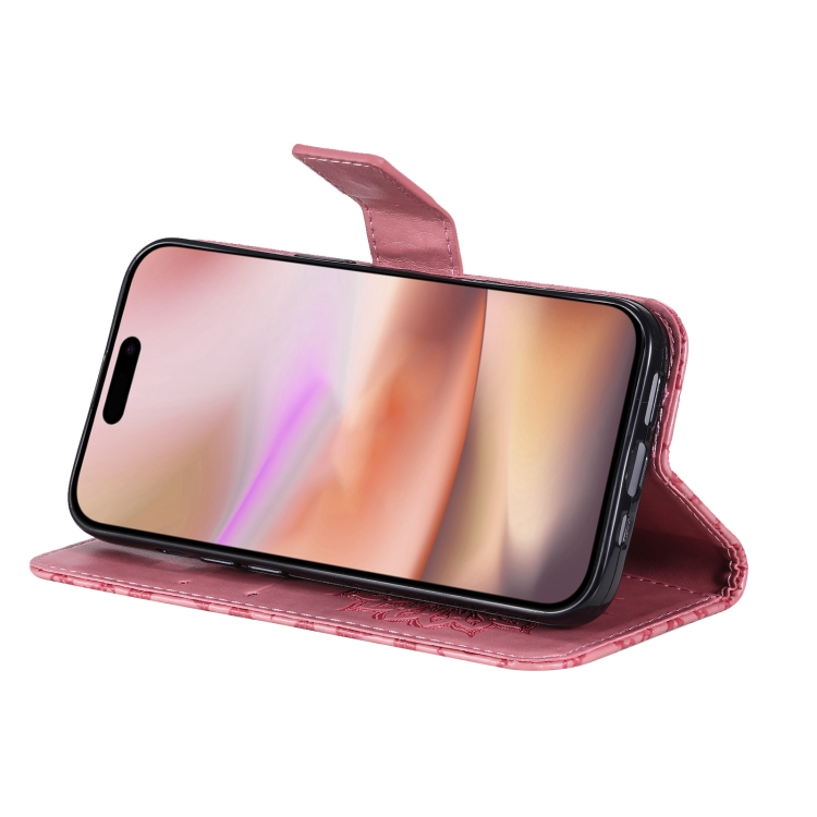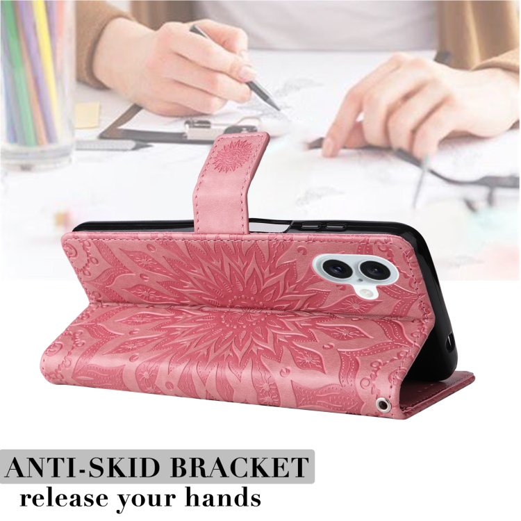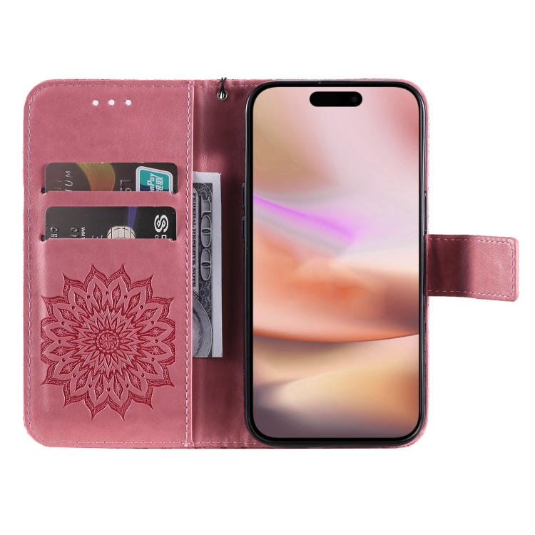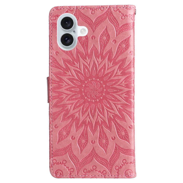 Funda de Cuero para iPhone 16 Plus con Tapa y Patrón de Girasol en Relieve (Rosa)