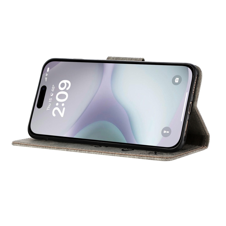 Funda de Cuero para iPhone 16 Plus con Tapa y Relieve de Mariposa (Gris)