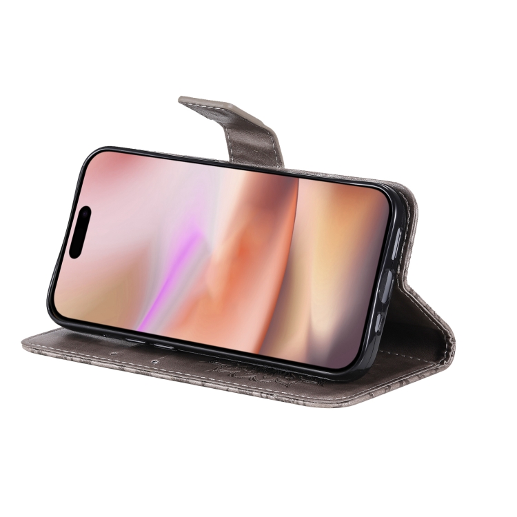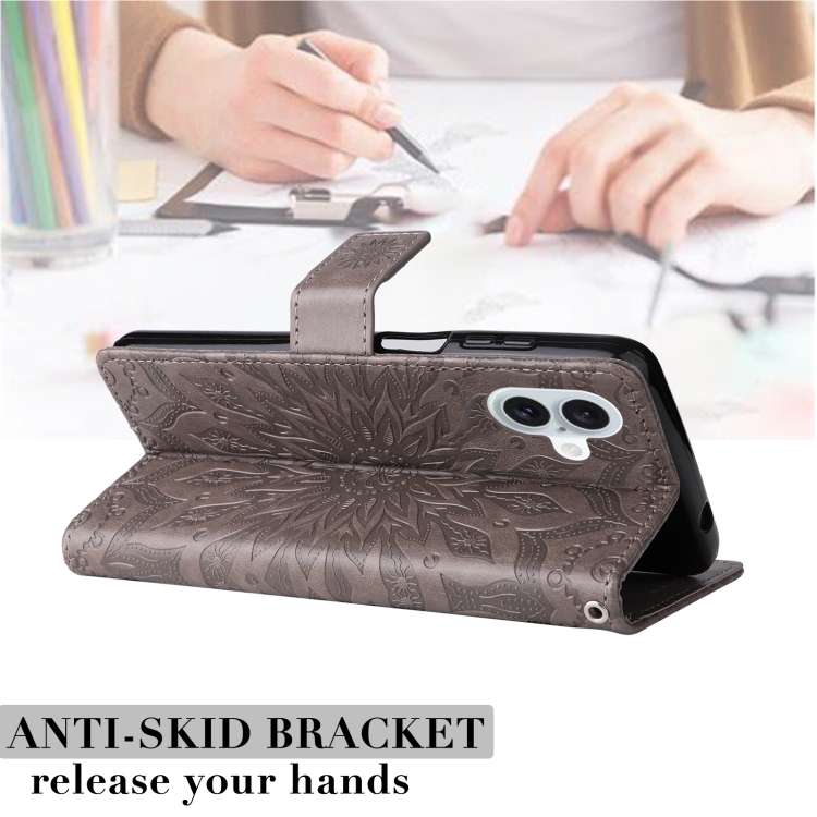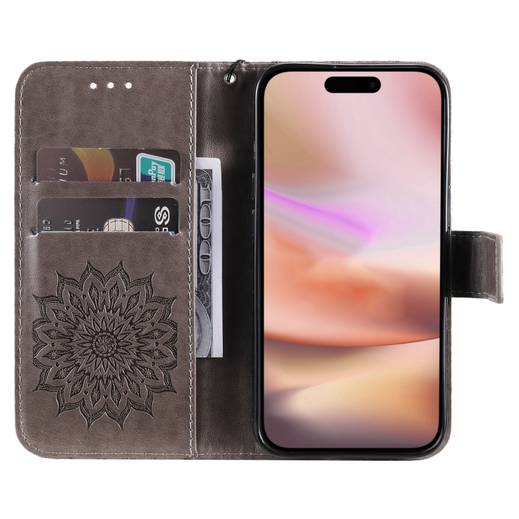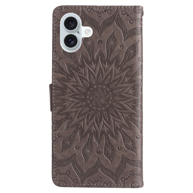 Funda para Teléfono iPhone 16 Plus Cuero con Tapa Patrón de Girasol En Relieve (Gris)