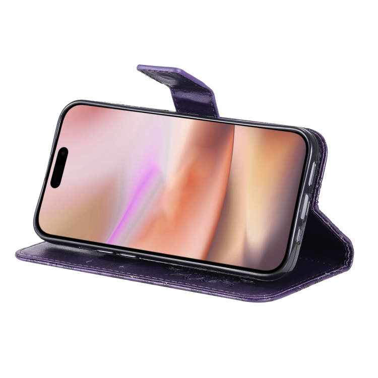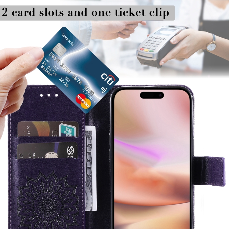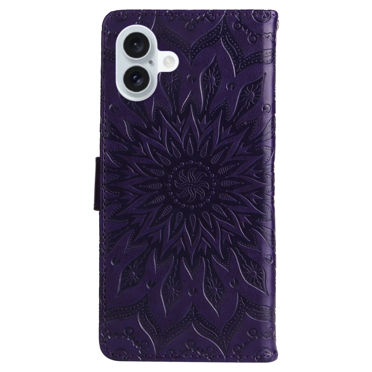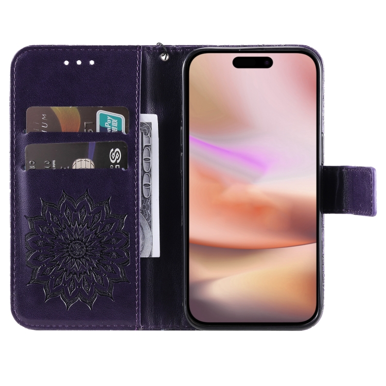 Funda para Teléfono iPhone 16 Plus Cuero con Tapa Patrón Girasol En Relieve (Púrpura)