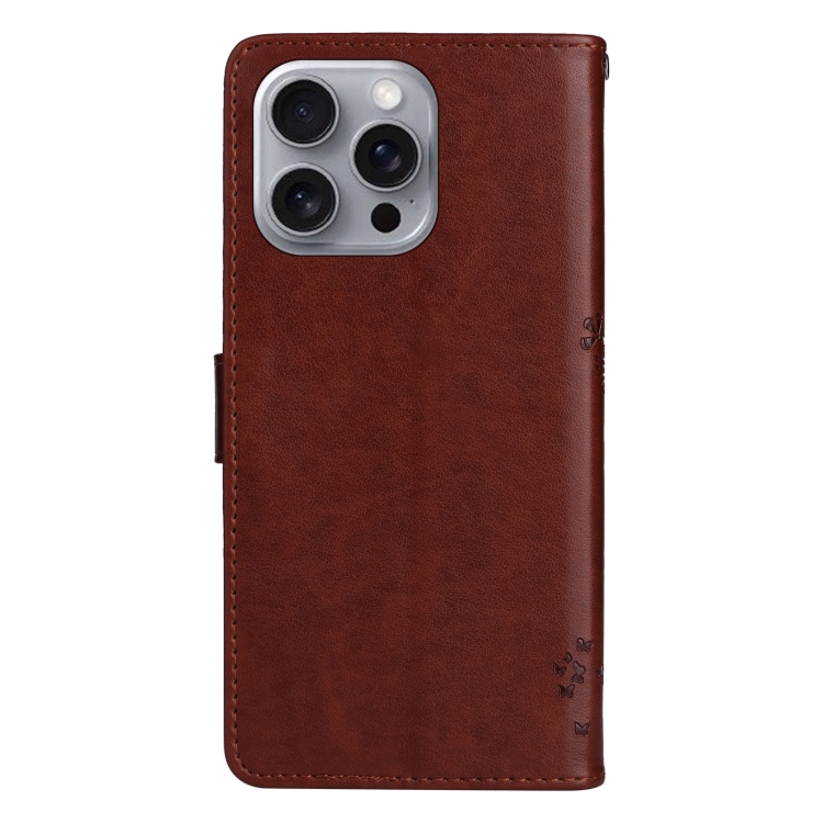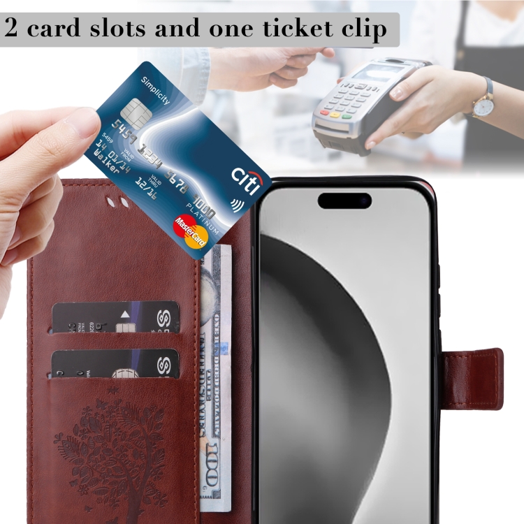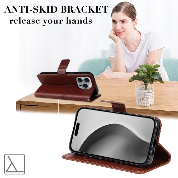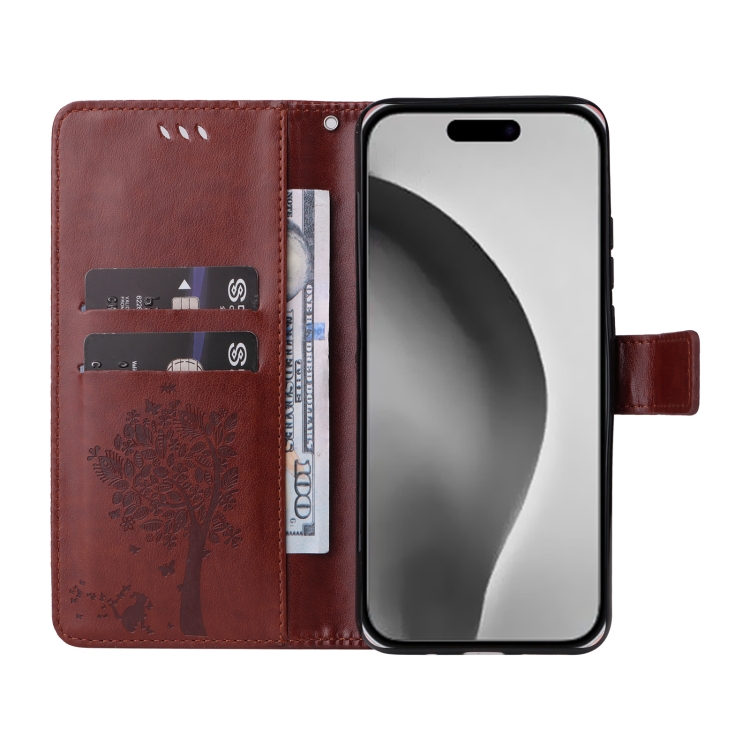 Funda para Teléfono iPhone 16 Pro Max Cuero con Tapa Patrón Árbol y Gato (Café)