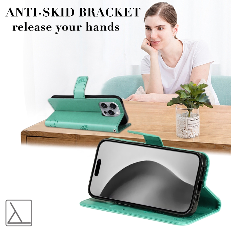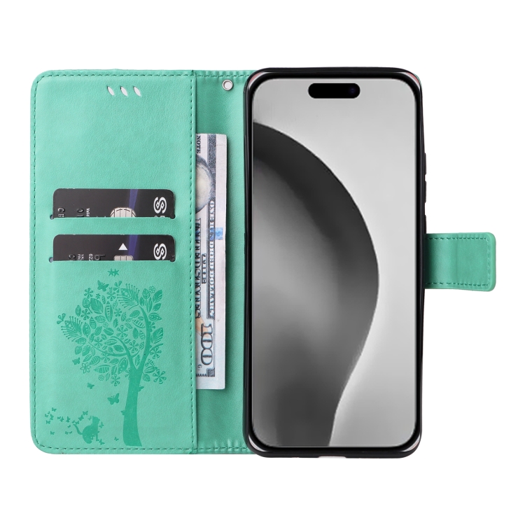 Funda para Teléfono iPhone 16 Pro Max Cuero con Tapa Patrón Árbol y Gato (Verde)
