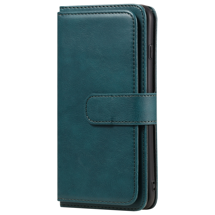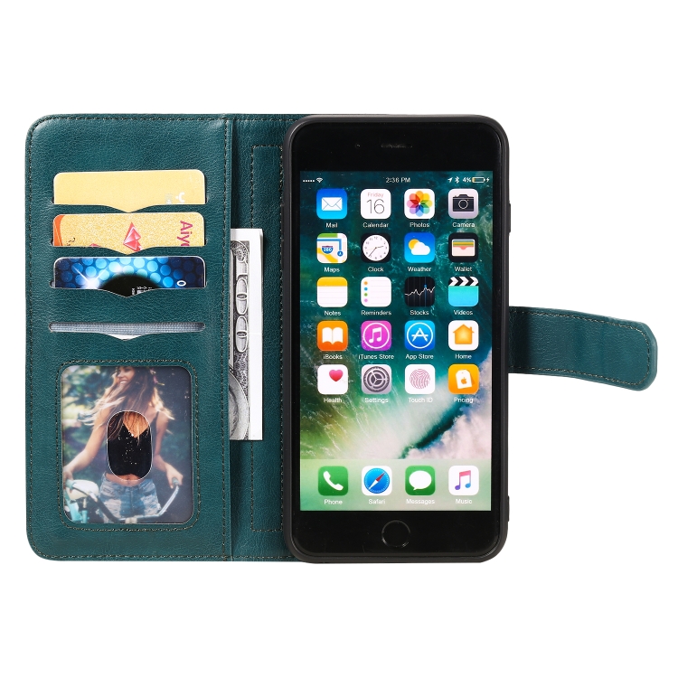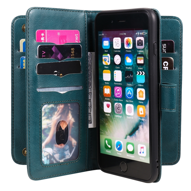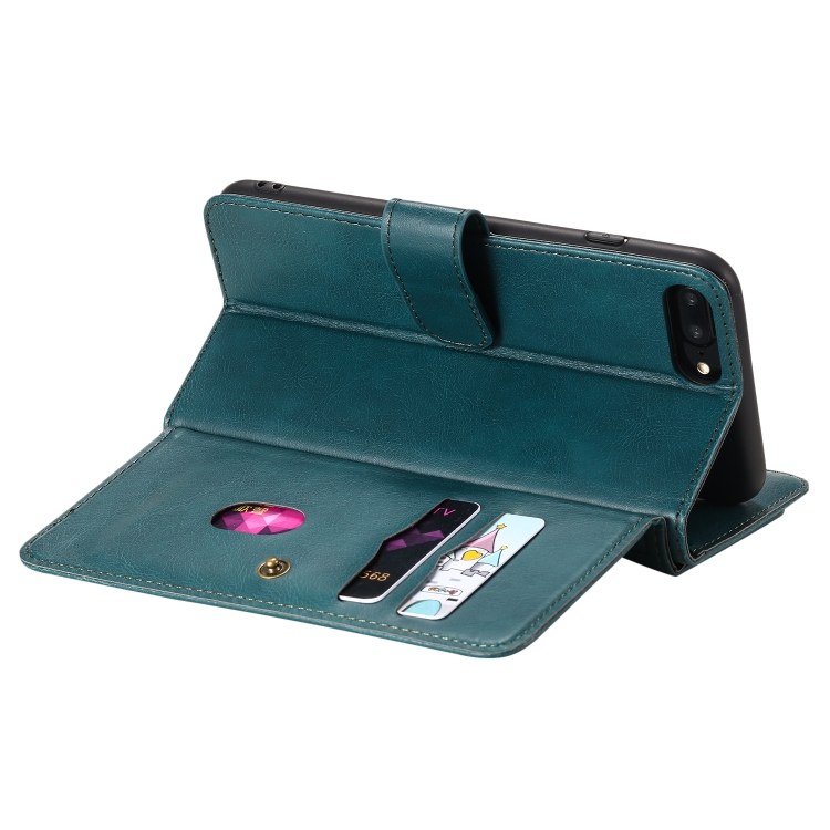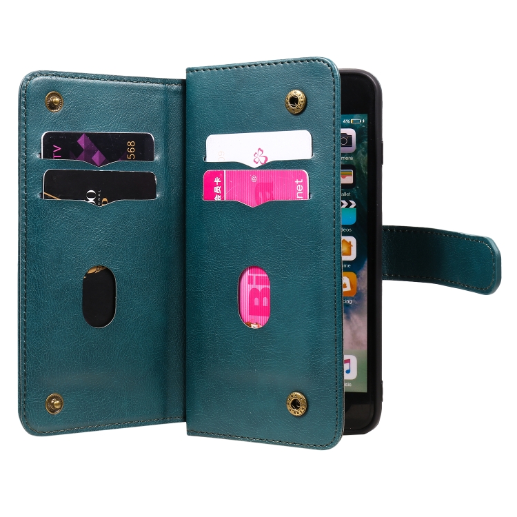 Funda de Cuero para iPhone 8 Plus y 7 Plus Hebilla de Cobre Multifuncional Tapa Horizontal con 10 Ranuras (Verde Oscuro)