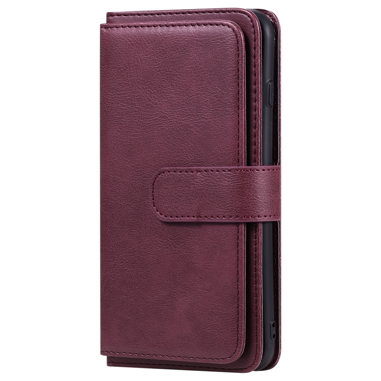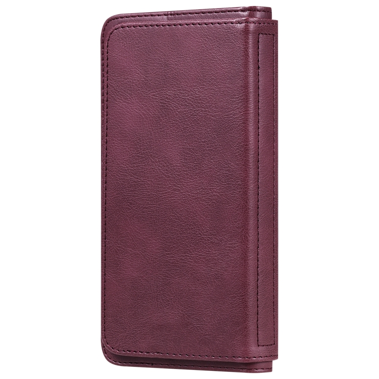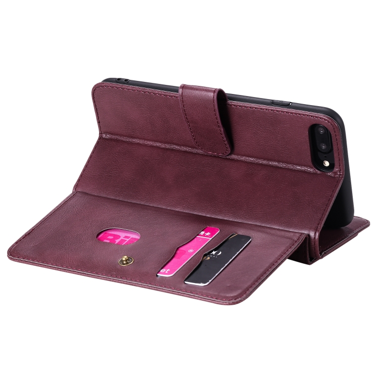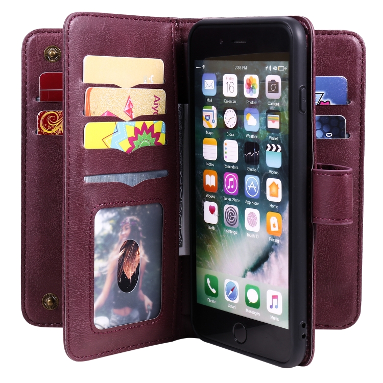 Funda de Cuero para iPhone 8 Plus y 7 Plus Hebilla de Cobre Multifuncional con Tapa Horizontal y 10 Ranuras (Rojo Vino)